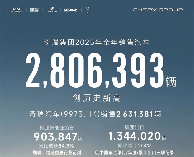 Сукупний обсяг продажу Chery Group у 2025 році досяг 2 806 393 автомобілів, що на 7,8% більше, ніж роком раніше. З цієї кількості 1 344 020 машин було відправлено на експорт, а річний приріст постачань за кордон становив 17,4%. Продажі автомобілів на нових джерелах енергії сягнули 903 847 одиниць, продемонструвавши стрімке зростання на 54,9% у річному вимірі. В результаті експорт сформував 47,9% загального обсягу продажу компанії за рік, що підкреслює головну роль іноземних ринків у бізнес-моделі Chery.