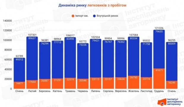 Кількість «пригнаних» автомобілів зменшилася у порівнянні з груднем 2025 на -61,0%, проте дещо перевищила показники січня минулого року, на 12,2%. Загалом для первинної реєстрації було заявлено 16 246 легкових машин з кілометражем, які прибули з-за кордону.
