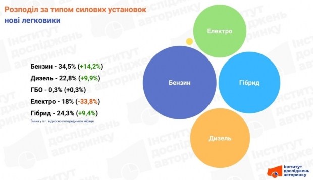Тут зафіксовано найбільш значні вагання. Коли в січні потік електромобілів практично зупинився, долі інших типів пального «зросли» виключно математично.
