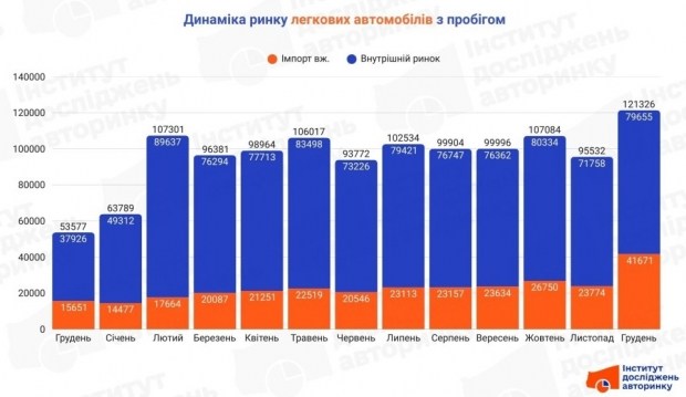 Обсяги внутрішнього ринку на діаграмі відображені у верхній (синій) частині стовпців, у нижній (помаранчевій) – обсяги імпорту вживаних легкових автомобілів, що ми згодом детально розглянемо в окремій статті.