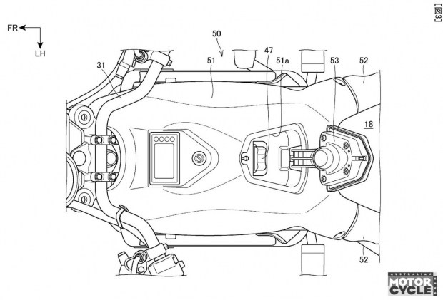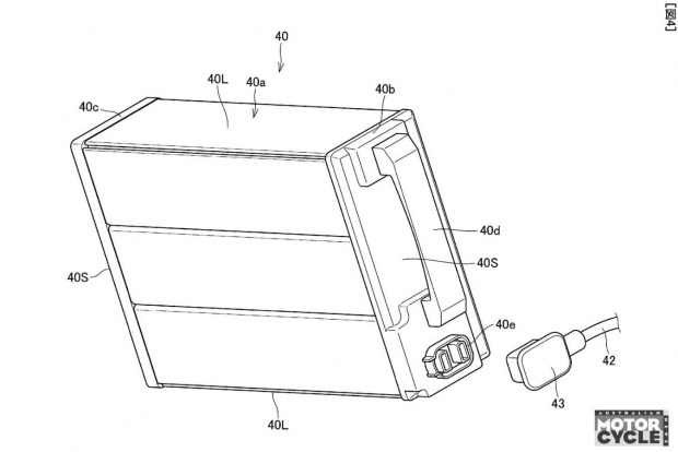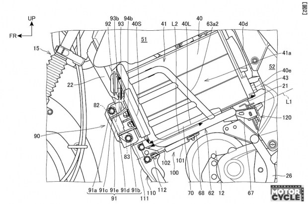 Саме акумуляторна система є ключовою ідеєю патенту. Замість інтеграції всередину рами або жорсткого кріплення, кожну батарею розміщено у металевій оболонці з обох боків мотоцикла. Ці оболонки відкидаються вперед на петлях, дозволяючи акумуляторам відхилятися назовні та безперешкодно вийматися. Після встановлення оболонки повертаються у вихідне положення, батареї входять у прорізи в «бакоподібному» облицюванні та фіксуються.